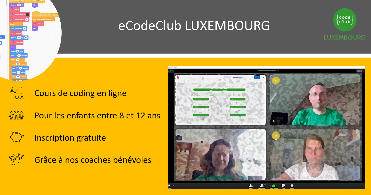 Depuis la rentrée scolaire 2020, nos clubs de Strassen et de Dippach se sont organisés pour créer un eCodeClub commun avec les enfants de ces deux clubs. Code Club Luxembourg souhaite transformer cet eCodeClub ‘local’ en un eCodeClub à l’échelle nationale et en élargir l’accès à bien plus d’enfants qu’actuellement.